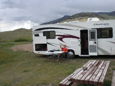 Im Yellowstone-Park war für die erste Nacht kein Campingplatz mehr frei. Außerhalb fanden wir im National Forest einen Platz, der uns mit einer Traumkulisse entschädigte.